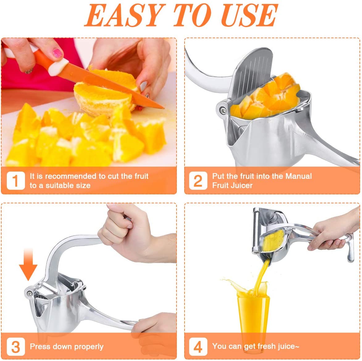 DURABLE AND HEALTHY: The manual citrus juicer is made of high quality aluminum .The aluminum alloy on the surface of the juicer is not in direct contact with the fruit, never worry about health and original flavor of the juice. Quickly get Vitamin C.